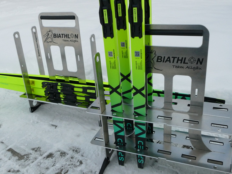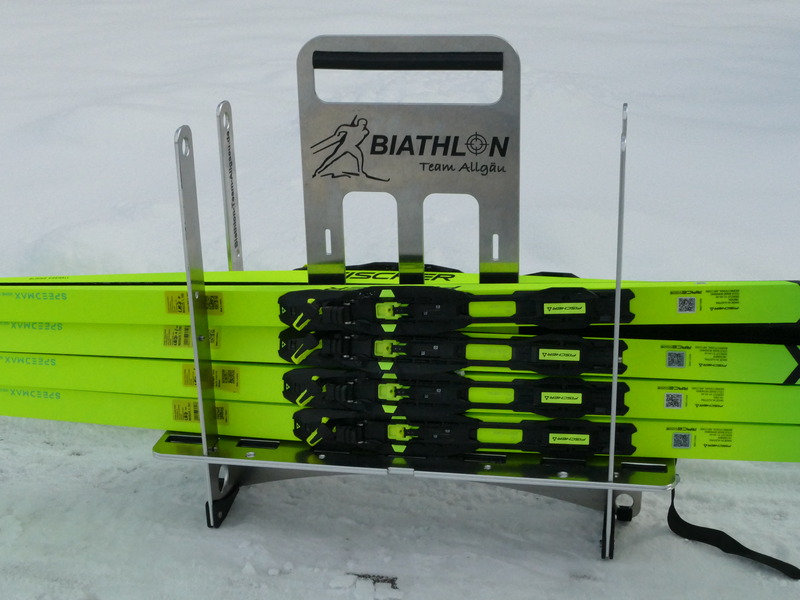 Skitrage für das Biathlon Team Allgäu. Mit einer Zusatzplatte lässt sich die Skitrage im Handumdrehen zum praktischen Skiständer verwandeln: